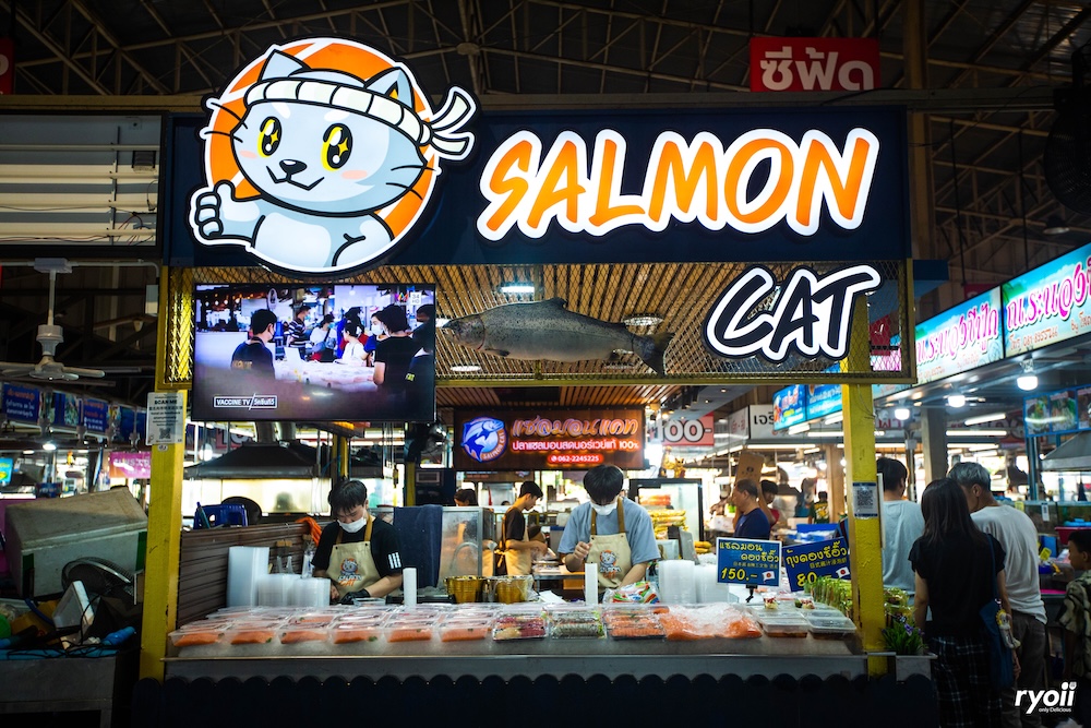 Salmon Cat ตลาดสดธนบุรี โซนซีฟู้ด : ร้านแซลมอนซาชิมิเจ้าดังในตลาดสดธนบุรีค่ะ ร้านนี้ถึงแม้จะไม่ใช่ร้านเก่าแก่ที่เปิดมานาน ร้านนี้แซลมอนที่เพิ่งเปิดให้บริการช่วงโควิด แต่ก็เป็นร้านที่มีชื่อเสียงสุดๆ ในย่านนี้เลยก็ว่าได้ค่ะ ใครที่อยากจะทานแซลมอนสดๆ ชิ้นสวยๆ แนะนำเลยค่ะ สำหรับแซลมอนของทางร้านจะเลือกใช้แซลมอนสดๆ ส่งตรงจากนอร์เวย์ แล่สดใหม่ทุกวัน ถ้าหากใครผ่านไปที่ร้านก็จะได้เห็นลีลาการแล่แซลมอนอยู่ตลอดเลยล่ะค่ะ เมนูแนะนำ คือ แซลมอนดองซีอิ๊วญี่ปุ่น, แซลมอนซาชิมิพรีเมียม, โฮตาเตะ ซาชิมิ และปลาทูน่าซาชิมิ (ราคาขึ้นอยู่กับน้ำหนัก)