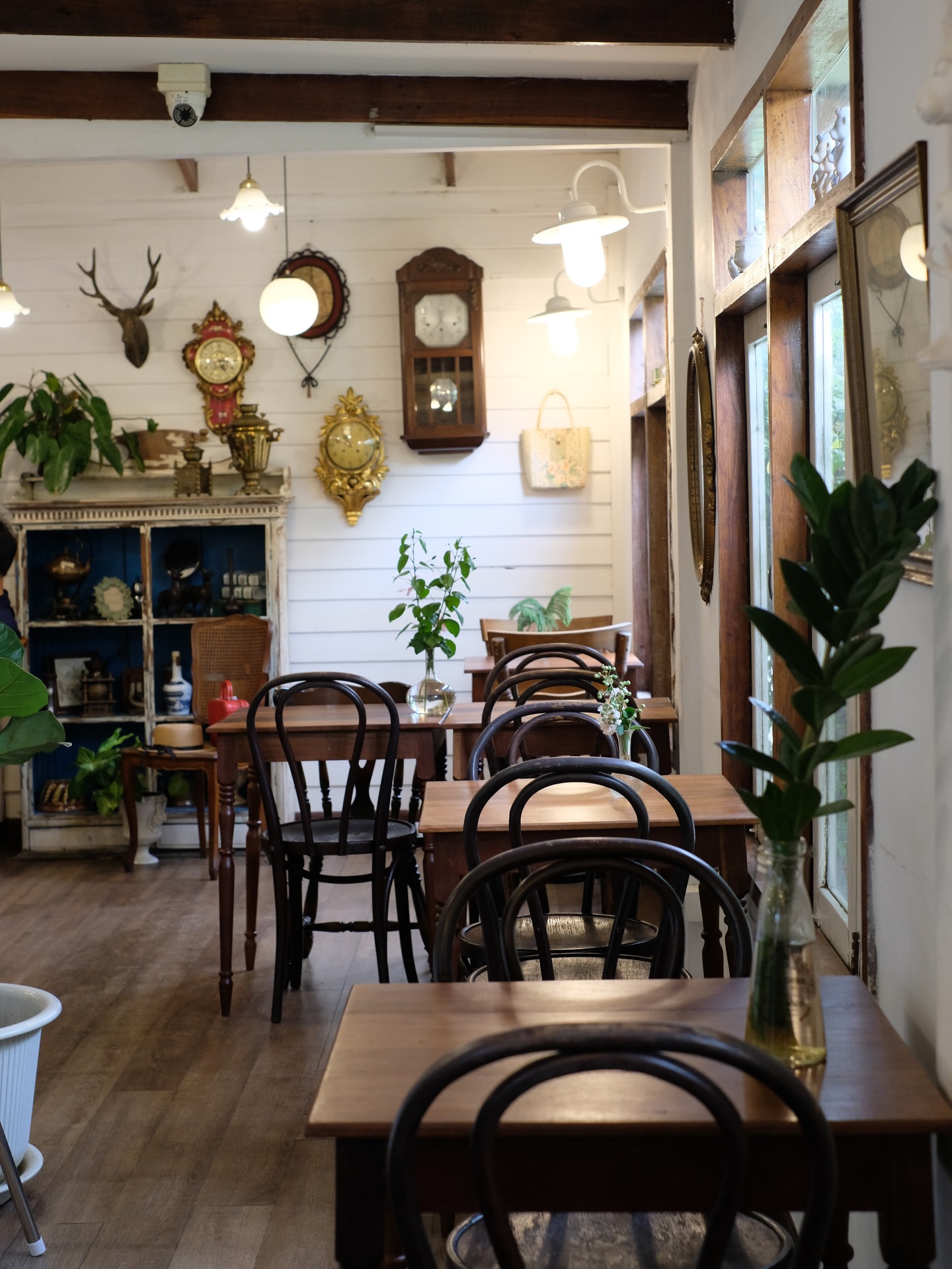 เมื่อก้าวเข้ามาด้านใน จะสัมผัสได้ถึงบรรยากาศวินเทจอบอุ่น เฟอร์นิเจอร์ไม้ โต๊ะเก้าอี้ดีไซน์คลาสสิก ผนังประดับด้วยนาฬิกาเก่า ของตกแต่งสไตล์ยุโรป และแจกันดอกไม้เล็ก ๆ ที่ช่วยเติมเสน่ห์ให้ร้านดูมีชีวิตชีวา แสงไฟโทนอุ่นส่องลงมาพอดี ทำให้บรรยากาศภายในดูสงบ น่านั่ง จะมาคนเดียว มาคู่ หรือมานั่งคุยยาวๆ กับเพื่อนก็ลงตัวทุกมุม แถมยังมีมุมถ่ายรูปสวยๆ ให้เลือกเพียบ