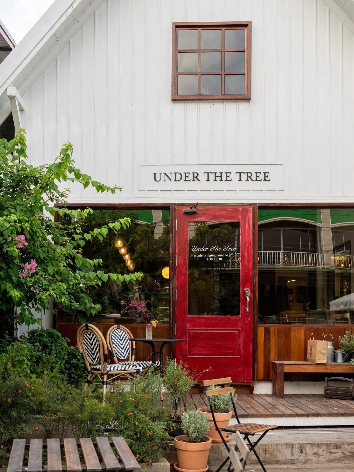 Under The Tree คือคาเฟ่บรรยากาศอบอุ่นที่ให้ความรู้สึกเหมือนได้แวะมานั่งพักผ่อนอยู่บ้านเพื่อน ตัวร้านมาในสไตล์บ้านสีขาวเรียบง่าย แซมด้วยประตูไม้สีแดงอันเป็นเอกลักษณ์ รายล้อมด้วยต้นไม้และสวนสีเขียว ให้ฟีลร่มรื่น สงบ และเป็นกันเองตั้งแต่ด้านนอก เหมาะมากสำหรับคนที่อยากหนีความวุ่นวาย มานั่งจิบกาแฟช้าๆ ในวันสบายๆ