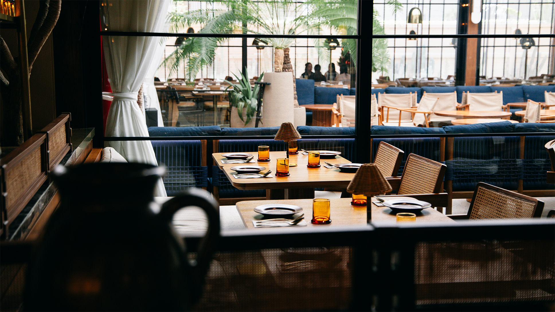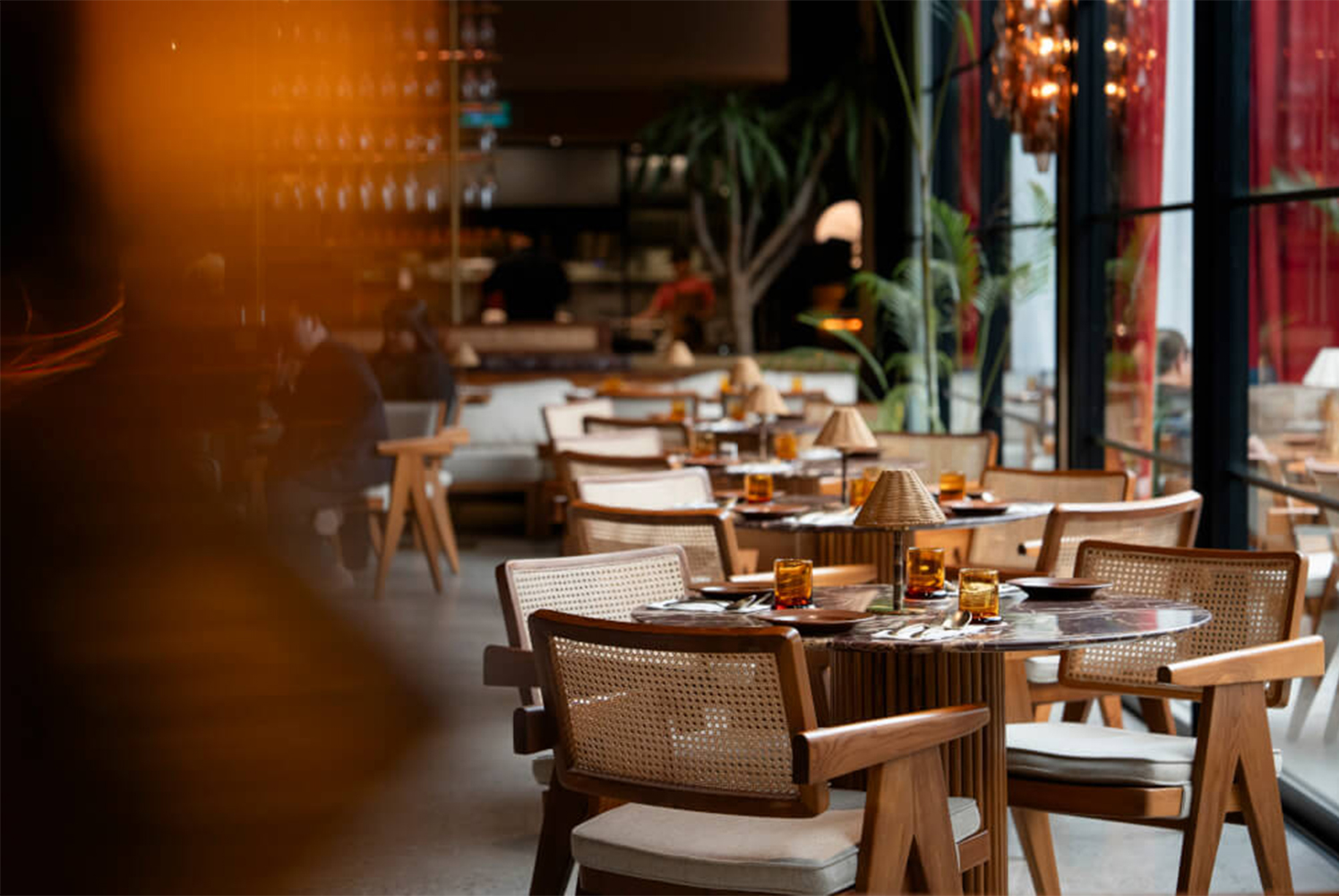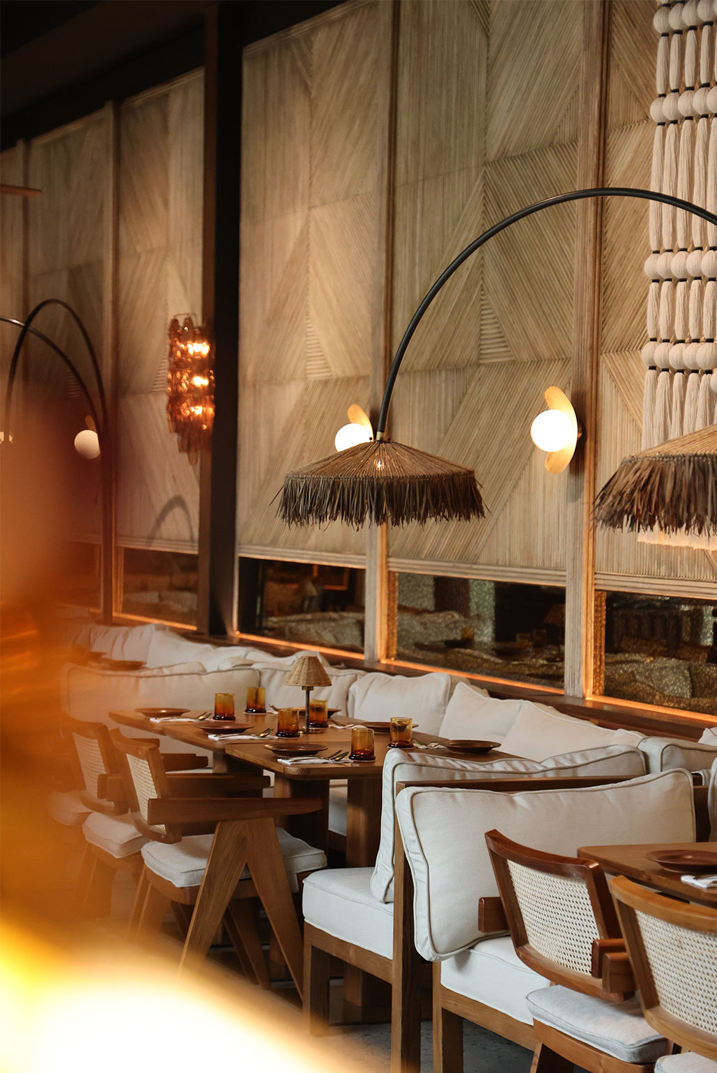 ร้านตกแต่งในโทนอบอุ่นแบบธรรมชาติ ผสมผสานไม้ งานหวาย และงานคราฟต์พื้นถิ่น ให้ความรู้สึกเรียบง่ายแต่มีรายละเอียด แสงไฟนวลตาและโทนสีน้ำตาล-ครีมช่วยสร้างบรรยากาศที่อบอุ่น ผ่อนคลาย แต่ยังคงความพรีเมียม เหมือนนั่งทานอาหารอยู่ในบ้านริมทะเลที่ถูกออกแบบอย่างตั้งใจ