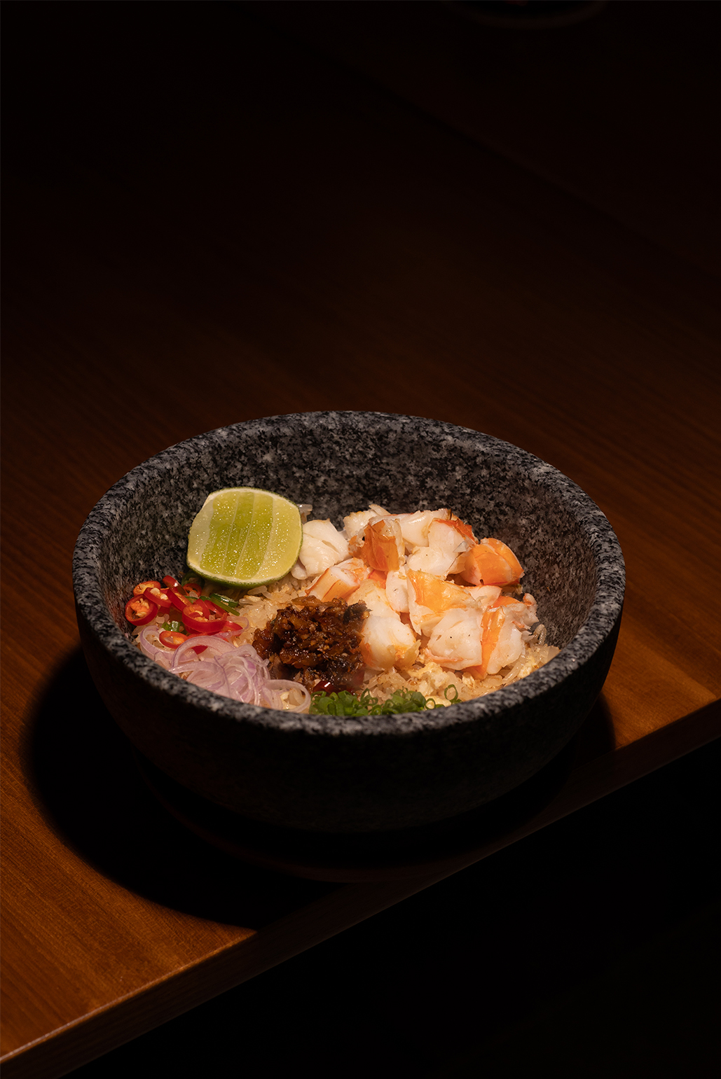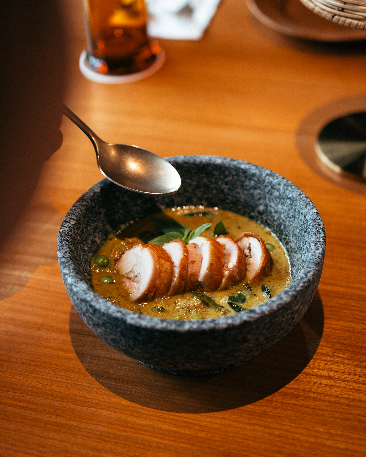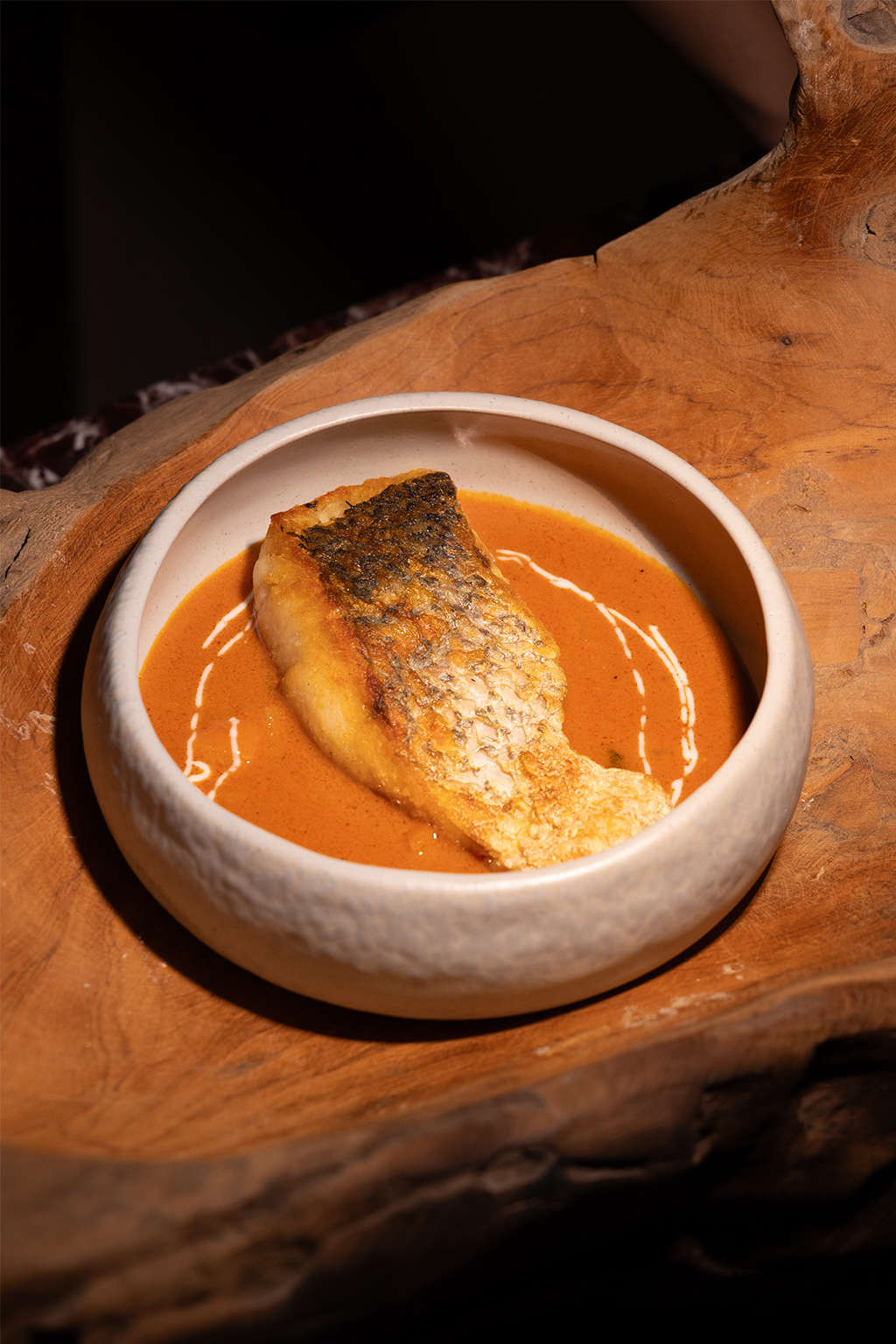 ร้านตกแต่งในโทนอบอุ่นแบบธรรมชาติ ผสมผสานไม้ งานหวาย และงานคราฟต์พื้นถิ่น ให้ความรู้สึกเรียบง่ายแต่มีรายละเอียด แสงไฟนวลตาและโทนสีน้ำตาล-ครีมช่วยสร้างบรรยากาศที่อบอุ่น ผ่อนคลาย แต่ยังคงความพรีเมียม เหมือนนั่งทานอาหารอยู่ในบ้านริมทะเลที่ถูกออกแบบอย่างตั้งใจ