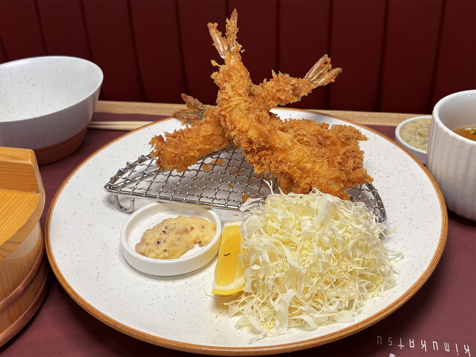 นอกจาก Mille-feuille Tonkatsu หมูทอด 25 ชั้น แล้ว ทางร้านยังมีเมนูจากทะเล นั่นก็คือ Salmon Katsu แซลมอนชุบเกล็ดขนมปังทอด กรอบนอก เนื้อด้านในนุ่มฉ่ำ และ Ebi Fry กุ้งชุบเกล็ดขนมปังทอด กรอบฟูเต็มคำ เนื้อกุ้งเด้งกำลังดี ทั้งสองเมนูเสิร์ฟพร้อม ซอสทาร์ทาร์สไตล์ฝรั่งเศส ช่วยเพิ่มความสดชื่นและความกลมกล่อม เข้ากันได้ดีเป็นพิเศษกับคัตสึจากทะเล