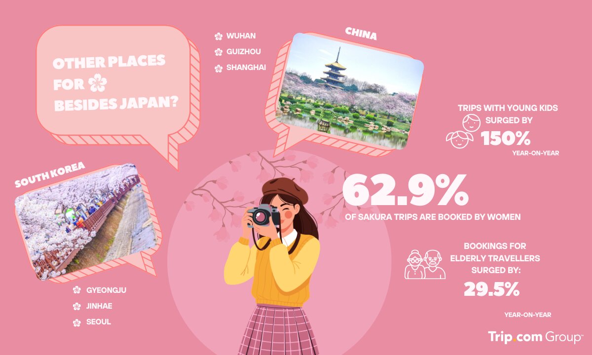 จากการศึกษาข้อมูลนักท่องเที่ยวทั่วโลกพบว่านักท่องเที่ยวผู้หญิงเป็นผู้จองทริปชมซากุระถึง 62.9% โดยส่วนใหญ่อยู่ในกลุ่มอายุ 25-49 ปี ซึ่งคิดเป็นสัดส่วนมากกว่าครึ่งหนึ่งของการจองทั้งหมด ขณะเดียวกัน ยังพบการเติบโตที่น่าสนใจในกลุ่มอื่น ๆ ได้แก่ นักท่องเที่ยวอายุ 60 ปีขึ้นไป ซึ่งเพิ่มขึ้น 29.5% ต่อปี และทริปครอบครัวที่มีเด็กเล็ก ซึ่งเติบโตสูงถึง 150% ต่อปี