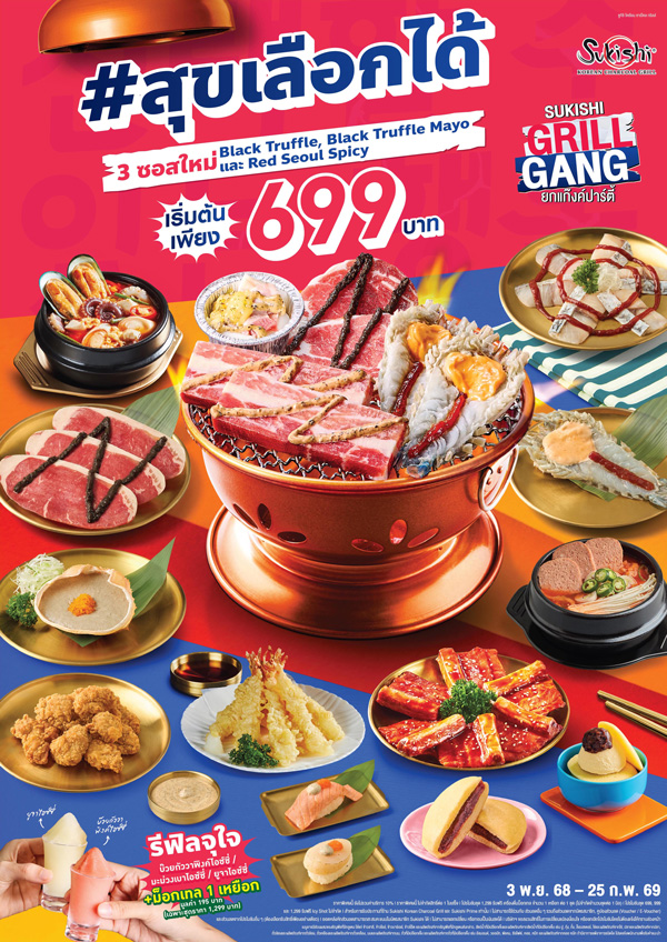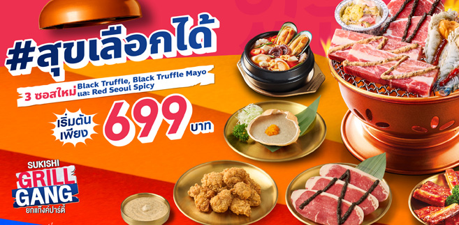 ใกล้ช่วงสิ้นปีทีไร หลาย ๆ บริษัทมักจะเริ่มเลี้ยงส่งท้ายกันแล้ว ไม่ว่าจะเป็นการเลี้ยงทั้งแผนก หรือเลี้ยงทั้งออฟฟิศ เพื่อส่งท้ายปีเก่า-ต้อนรับปีใหม่ และถ้าใครยังไม่คิดไม่ออกว่าจะไปเลี้ยงกันที่ไหนดี Sukishi ถือว่าเป็นอีกหนึ่งตัวเลือกสุดคุ้มสำหรับการกินแบบยกทีม เพราะล่าสุด Sukishi สุข Overload ชวนมาเปิดเตาแบบยกแก๊งค์ กับแคมเปญใหม่ Sukishi Grill Gang รอบนี้พร้อมเสิร์ฟกับ 3 ซอสใหม่ ได้แก่ Black Truffle, Truffle Mayo และ Red Seoul Spicy ตอบโจทย์กับสายปิ้งย่างแบบครบทุกรสชาติ จบงบได้แบบไม่บานปลาย ในราคาเริ่มต้นเพียง 399 บาทเท่านั้น